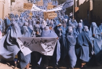 in erdigen Tönen, nur unterbrochen von einheitlich blauen Burkhas, sprechen