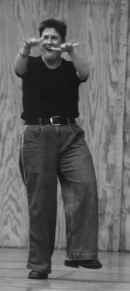 Schlagzeugerin. Auf der Night Stage wird an diesem Donnerstagabend ein Beispiel für die Vielfalt des Festivals präsentiert - entgegen bösen Gerüchten ist die Frauenmusikszene nämlich durchaus nicht auf Folkmusik und Lesben mit Gitarre beschränkt. Auf die fünfköpfige Jazzband Straight Ahead aus Detroit folgen Ulali, drei indigene Frauen, die sich der Bewahrung traditioneller Gesänge und Instrumente der "First Nation People" verschrieben haben. (Der Begriff "Native American" wird von vielen abgelehnt, da sie bzw. ihre Vorfahren schon hier waren, als an Amerika nicht zu denken war.) Als letztes entern die drei Dykes der Gruppe The Butchies die Bühne. Zu ihrer Rockmusik der Marke "lesbisch, laut und lustig" hopsen alle Frauen fröhlich auf und ab. |