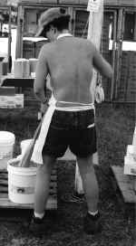 6000 bis 10.000 Frauen, nicht nur aus den USA, reisen jedes Jahr Anfang August an eine verschlafene Abzweigung an einer Landstraße in Michigan, dann noch fünf km Sandweg und da ist es endlich: The Land. Das ist ein Begriff, der von den Frauen mit beinahe verklärter Stimme ausgesprochen wird. "Das Land" ist ein Stück Natur, bestehend aus viel Wald und ein paar Wiesen, teilweise leicht hügelig, insgesamt etwas mehr als 2,6 Quadratkilometer (=2.630.420 m2). Seitdem das Stück von dem Kollektiv erworben wurde, wird es jedes Jahr nur für dieses Festival genutzt. Vier Wochen vor der Eröffnung reisen die "Worker" an: Frauen aus aller Welt, die die ganze Infrastruktur aufbauen. Mit der Ausrüstung und der Erfahrung von 25 Jahren Festival-Organisation stellen sie die riesengroßen Bühnen auf, verlegen Wasser- und Stromleitungen, bauen die Duschen auf, legen neue Wege an, verlegen Teppiche, damit Rollifrauen überallhin gelangen können und errichten Verkaufsstände. Die Feuerstellen für die Kochtöpfe werden ausgehoben, Unmengen Holz aufgestapelt und große Zelte als Küchen- und Essenszelte aufgebaut. Nach einer Woche Festival wird alles komplett wieder abgebaut. Den Rest des Jahres verirrt sich vielleicht mal ein einsamer Wanderer auf das nicht eingezäunte Land, ansonsten haben die Tiere und die Natur ihre völlige Ruhe. | ![]() Das Essen für 7000 Frauen wird auf Holzfeuer gekocht. ![]() Jeder Komikerin fällt etwas zu den Porta-Janes ein. |